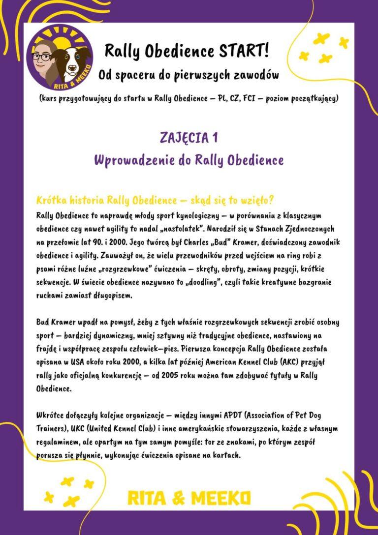 Główną ideą kursu jest wprowadzenie Cię w świat Rally Obedience i pokazanie, jak może wyglądać mądry, uporządkowany trening z psem. Zawody traktujemy jako opcję, a nie obowiązek.